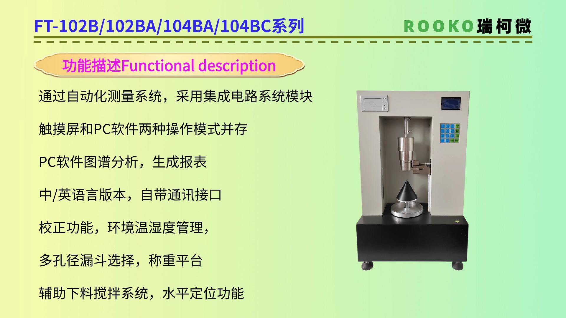特點(diǎn):休止角測(cè)定儀通常具有測(cè)量準(zhǔn)確、操作簡(jiǎn)便、重復(fù)性好等特點(diǎn)。此外,一些休止角測(cè)定儀還具有自動(dòng)化測(cè)量、數(shù)據(jù)記錄和分析等功能如FT-104BA。