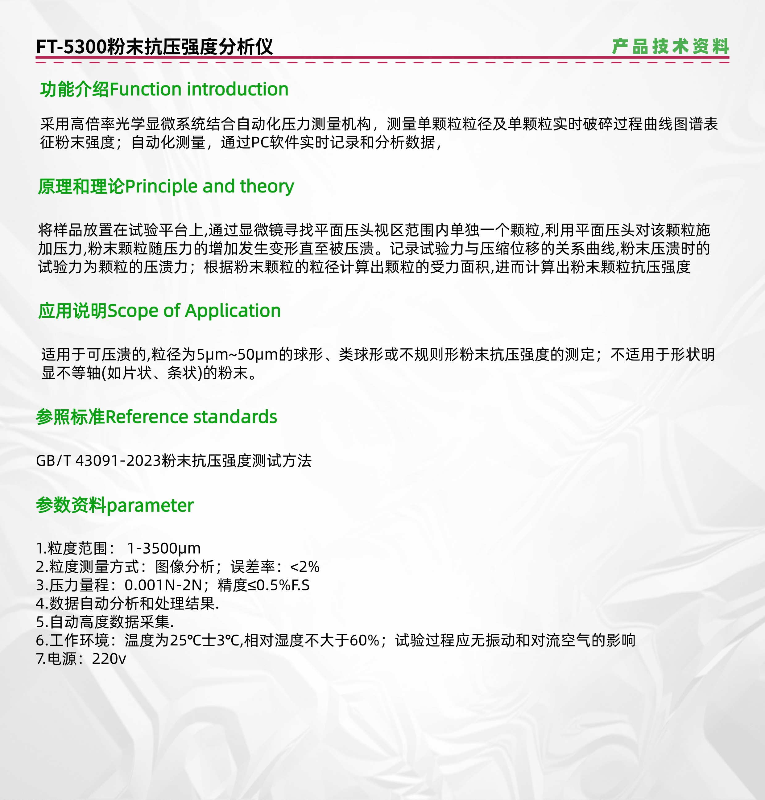 原理:將單個(gè)粉體顆粒置于兩個(gè)平行的平板或壓頭之間,通過逐漸增加壓力,直到顆粒被壓碎,記錄下顆粒破碎時(shí)所承受的zzui大壓力,以此來衡量顆粒的強(qiáng)度。