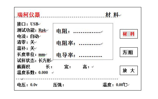 液晶顯示:電阻、電阻率、方阻、溫度、單位換算、溫度系數、電流、電壓、探針形狀、探針間距、厚度、電導率 |