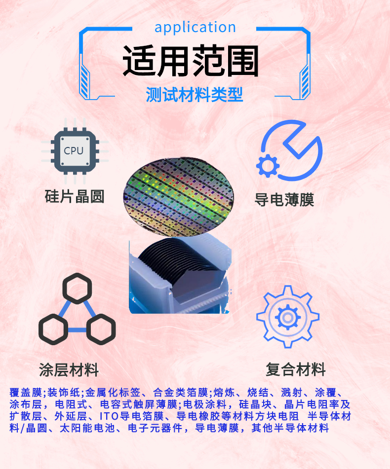 晶圓、非晶硅/微晶硅和導(dǎo)電膜電阻率測(cè)量;選擇性發(fā)射極擴(kuò)散片;表面鈍化片;交叉指樣PN結(jié)擴(kuò)散片;新型電極設(shè)計(jì),如電鍍銅電阻測(cè)量等;半導(dǎo)體材料分析,鐵電材料,納米材料,太陽(yáng)能電池,LCD,OLED,觸摸屏等.