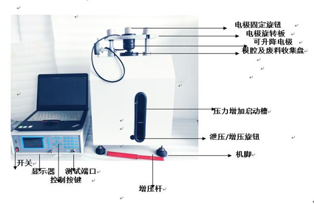 已知量的粉體,在液壓動力下壓縮體積至設(shè)定壓力值或壓強,在線測量粉體電阻、電阻率、電導(dǎo)率,并記錄數(shù)據(jù).